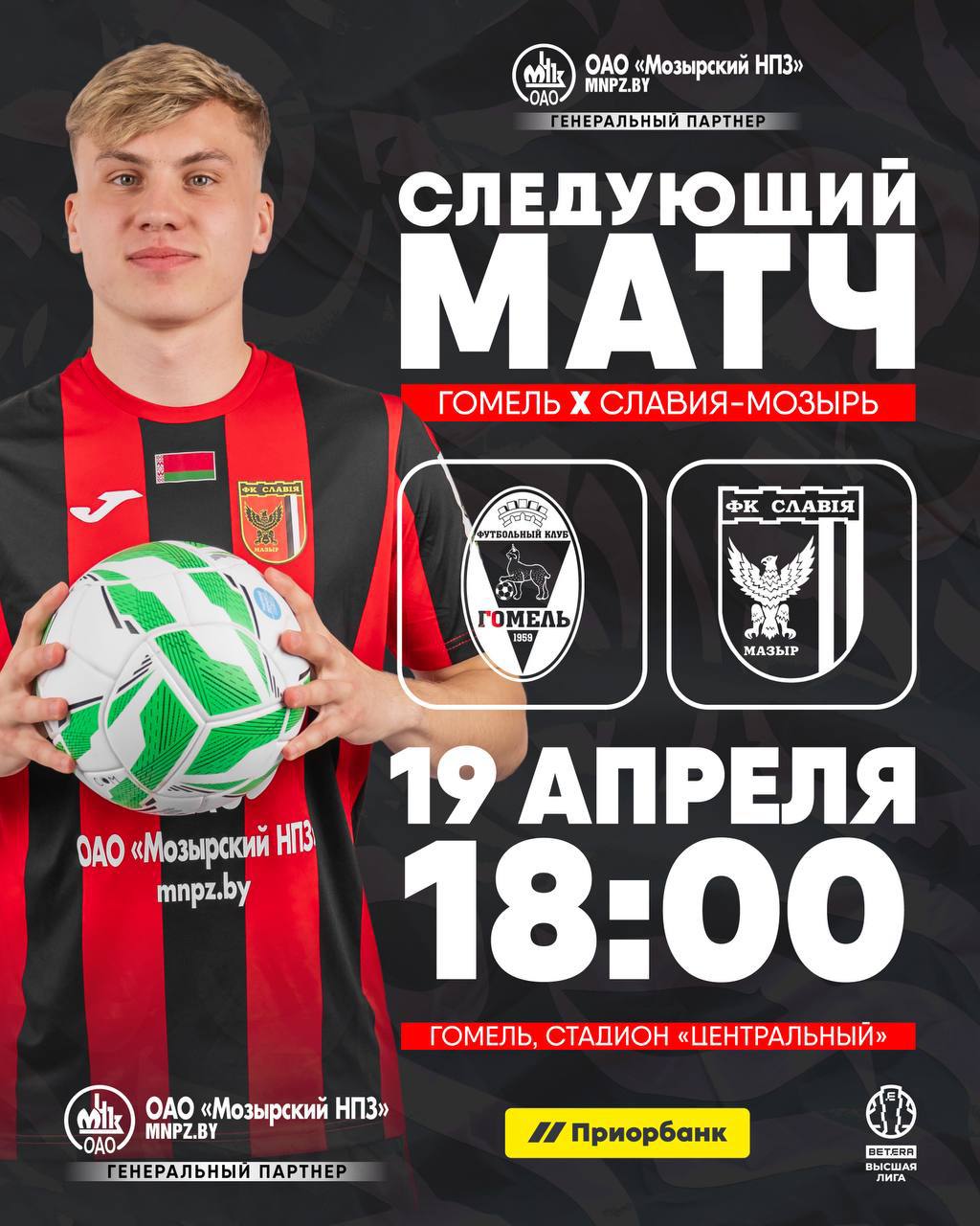🔥Полесское дерби «Гомель» — «Славия-Мозырь» пройдёт 19 апреля 2026 года. Матч 4-го тура Высшей лиги чемпионата Беларуси состоится на стадионе «Центральный» в Гомеле, начало в 18:00.